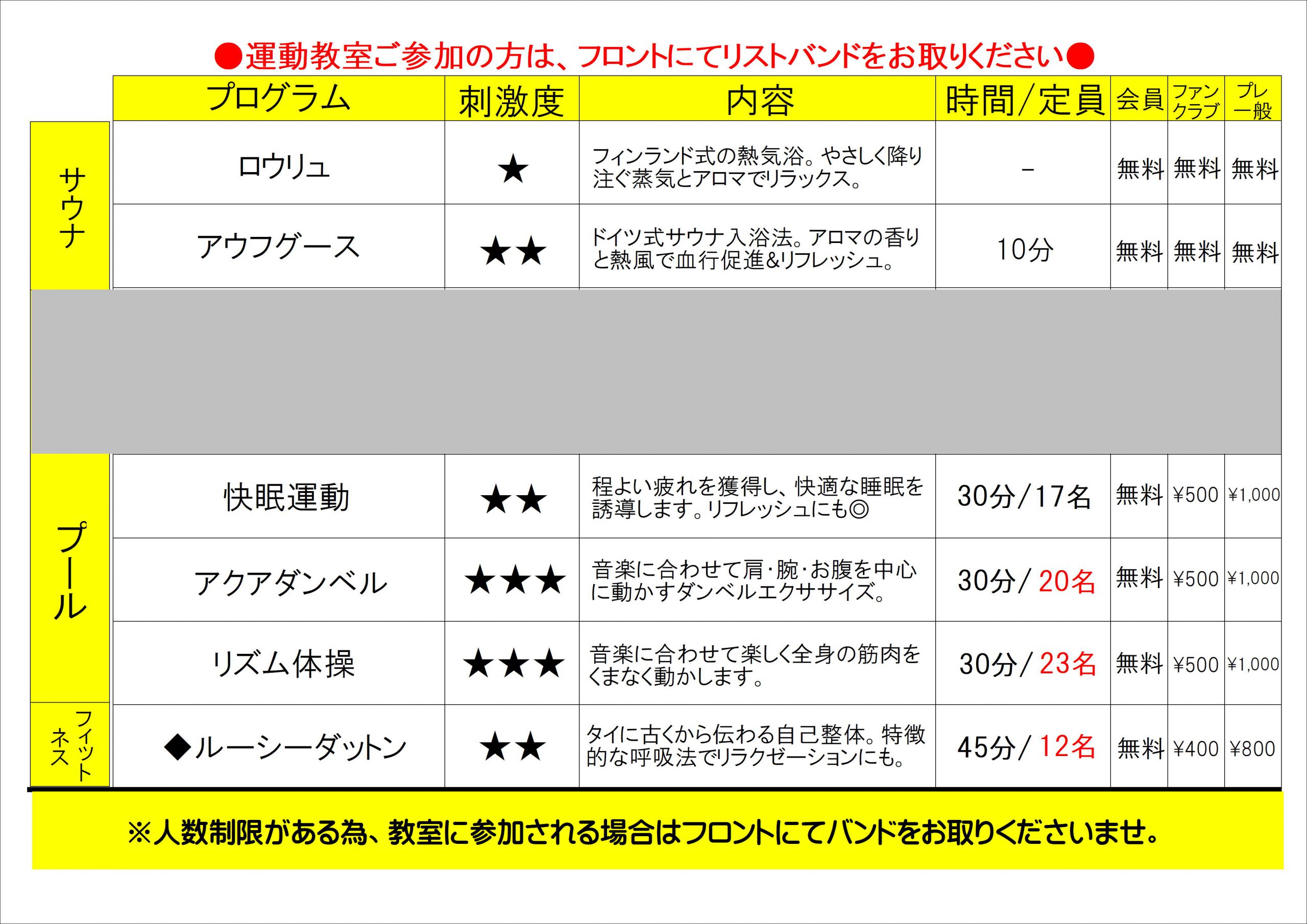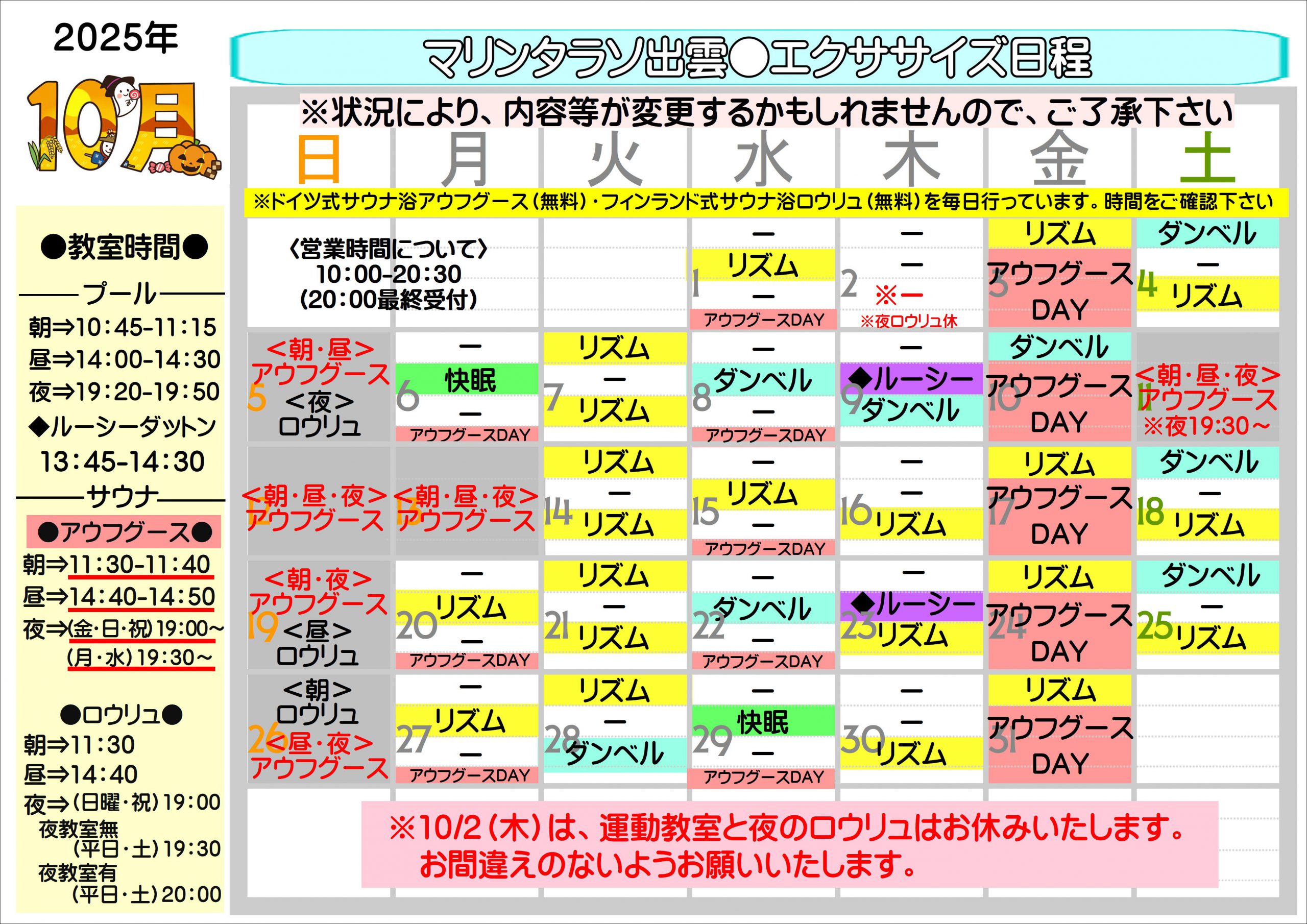 ※10月2日(木)夜の運動教室及びロウリュはお休みさせて頂きますので、